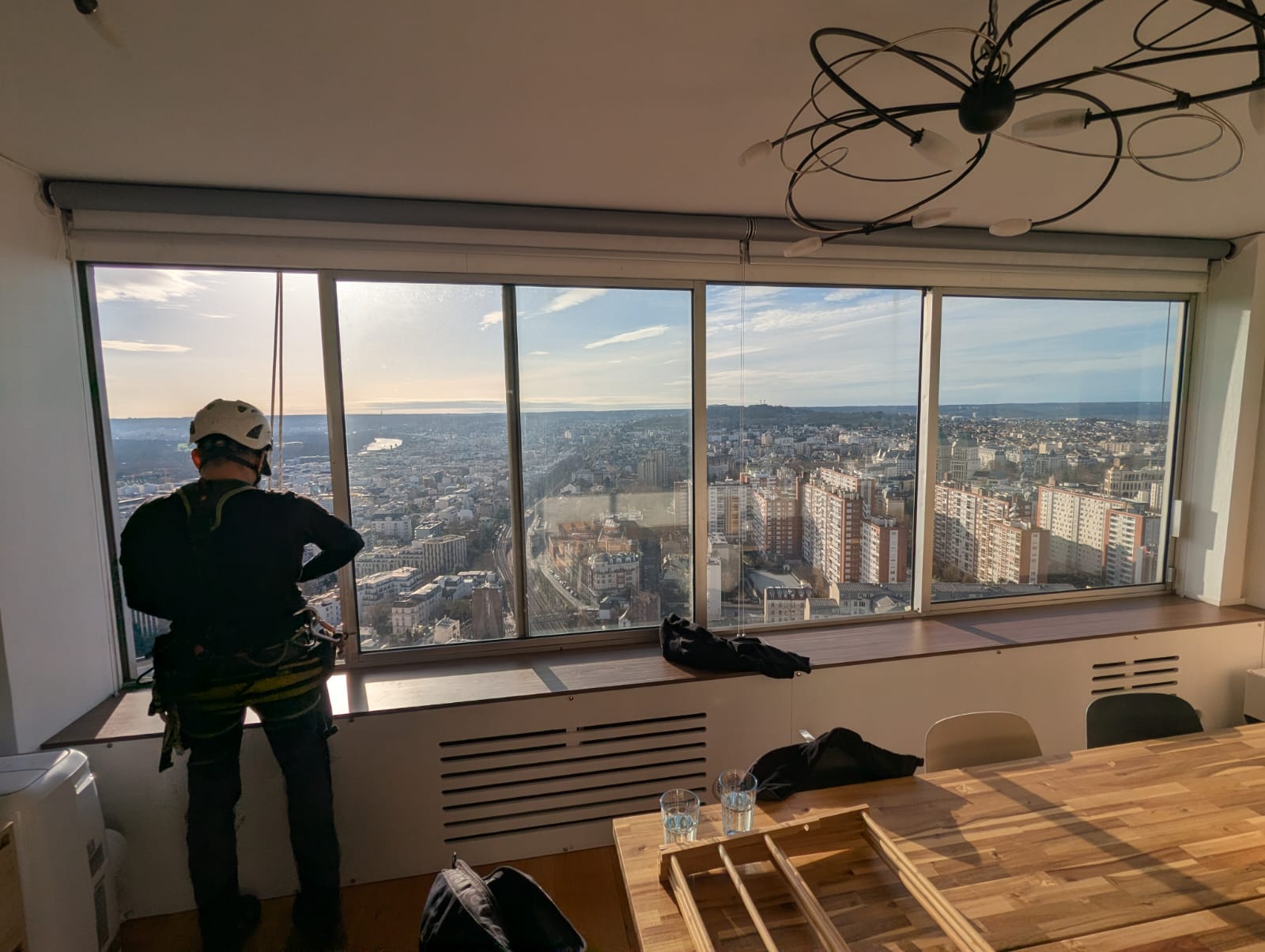 La baie vitrée concernée, d’une longueur de plus de 5 mètres, est composée de deux châssis ouvrants latéraux et d’un châssis fixe central. Elle fait partie intégrante de la structure de façade de la tour.