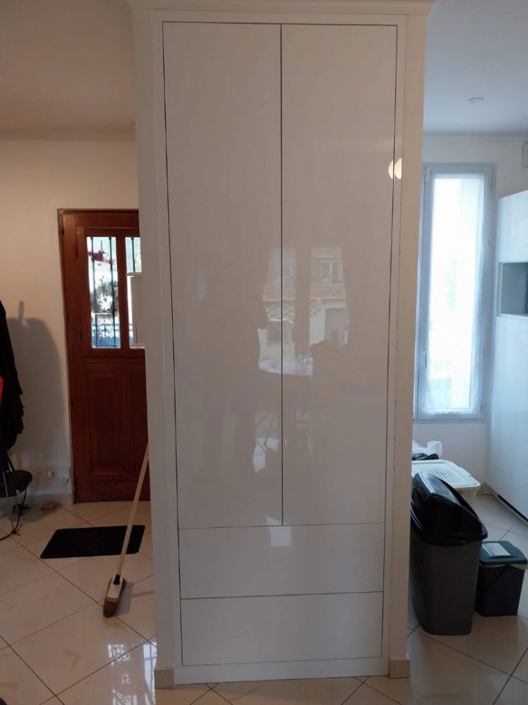 Le meuble a été fabriqué à partir de mélaminé blanc Unilin 025 CST, un matériau de haute qualité qui offre une excellente résistance aux rayures et aux impacts, tout en étant facile à nettoyer. Les découpes et assemblages ont été réalisés avec une précision artisanale pour garantir une finition parfaite. - Installation sur site :